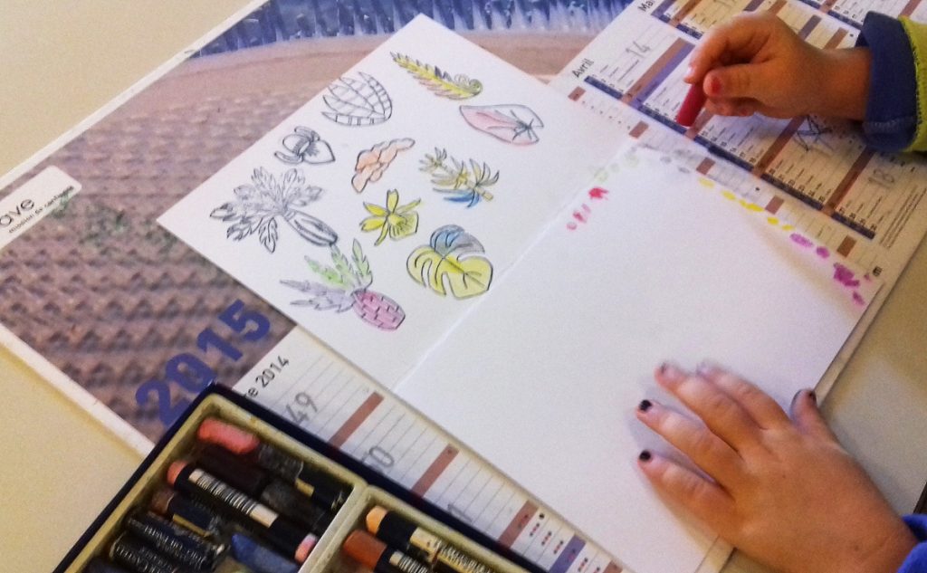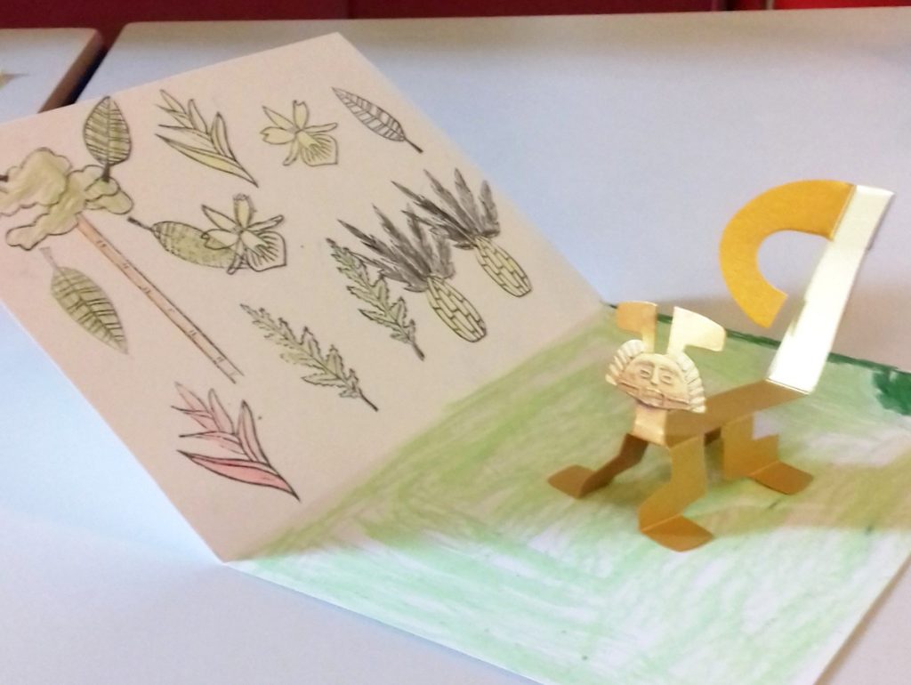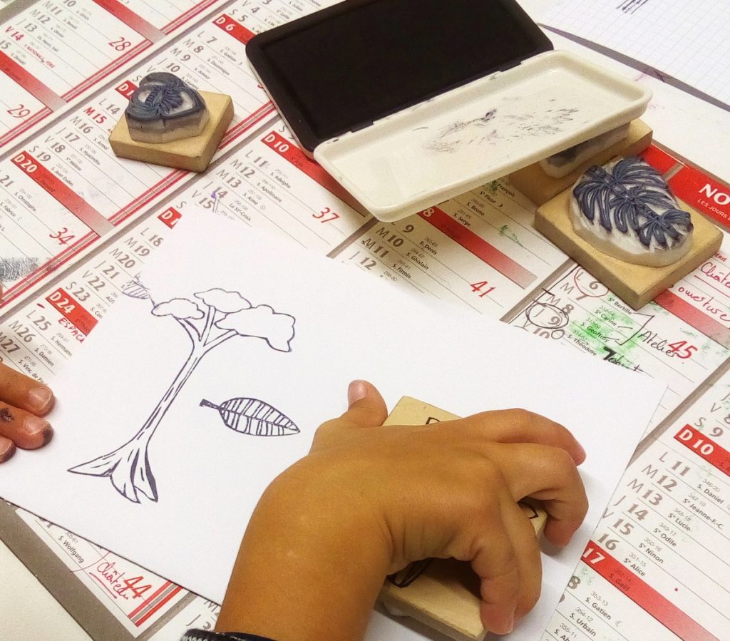 Le temps de cette expo, des ateliers pour les enfants étaient proposés. Ils y réalisaient des petits montages papier, avec un « jaguar » doré en papier (repris d’un objet en or symbolisant le jaguar présent dans l’expo), à coller sur une feuille sur laquelle, ils utilisaient les tampons qu’ils coloriaient ensuite.