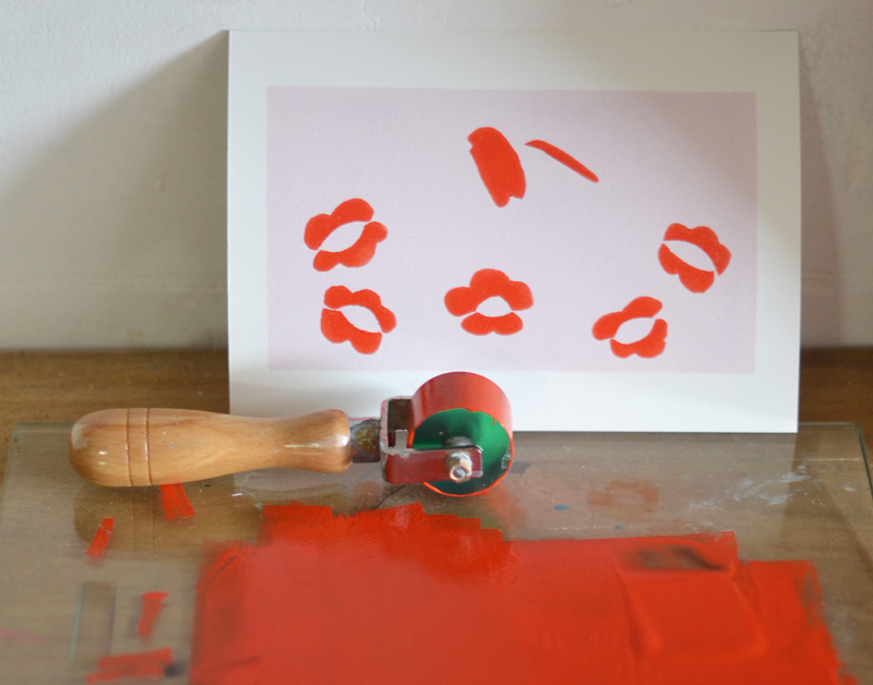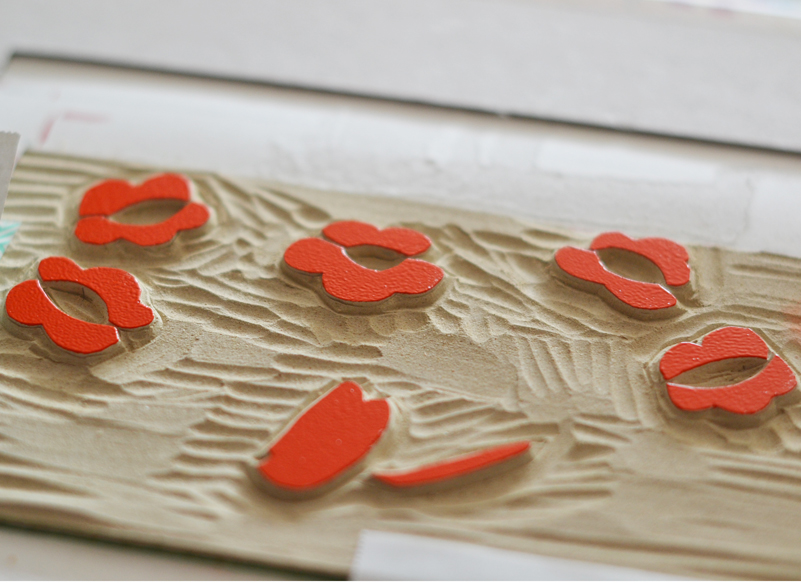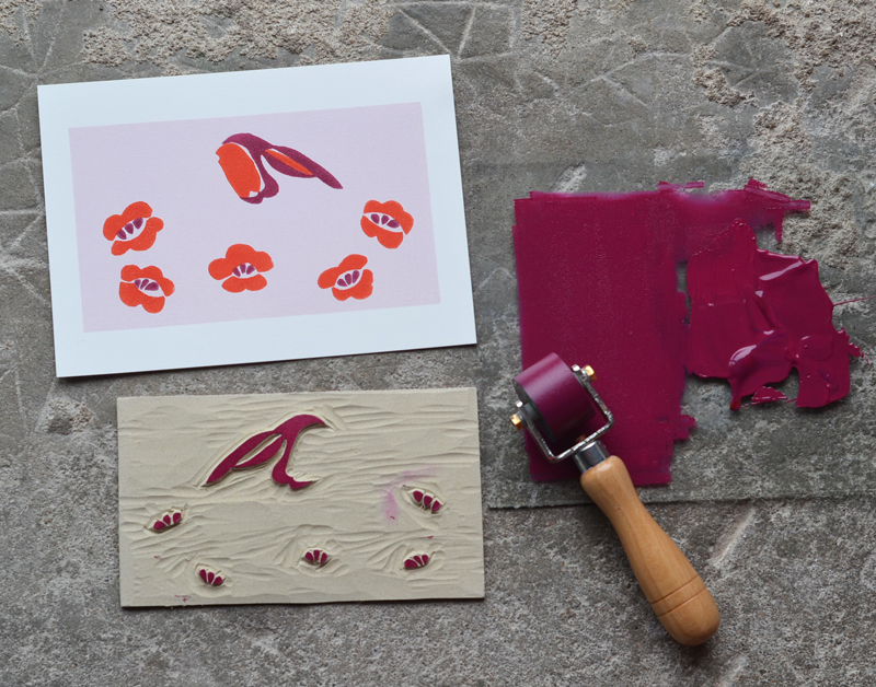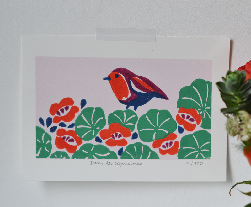 Une linogravure multi-plaque, 5 couleurs pour ce petit rouge-gorge camouflé dans les fleurs. Toujours pour cette série d’oiseaux un graphisme épuré. Je redessine jusqu’à ce que les formes soient simples mais néanmoins identifiables.