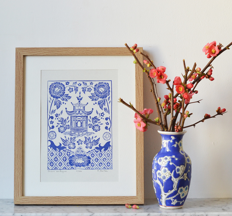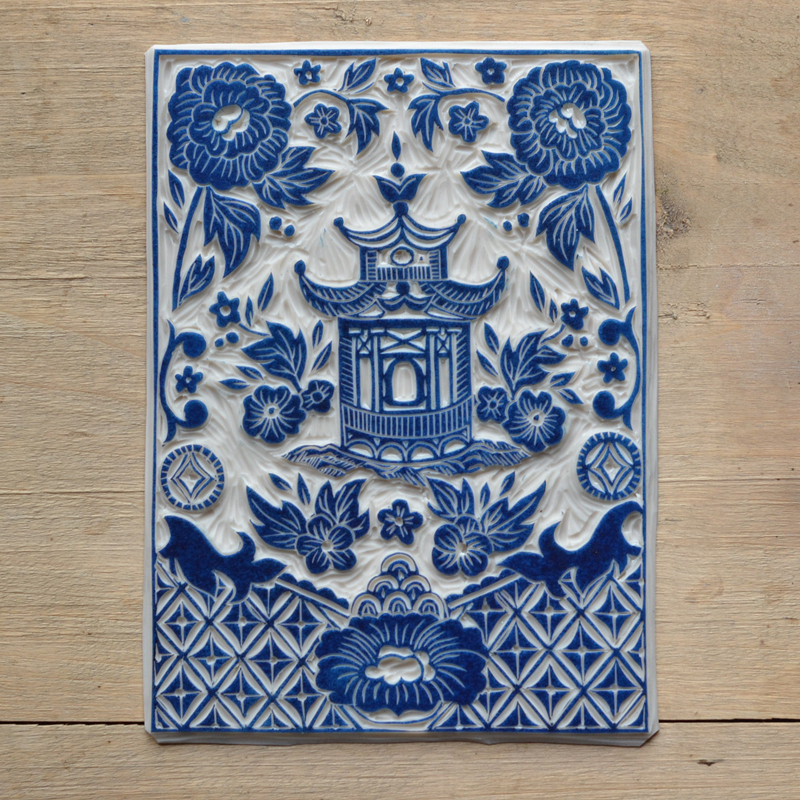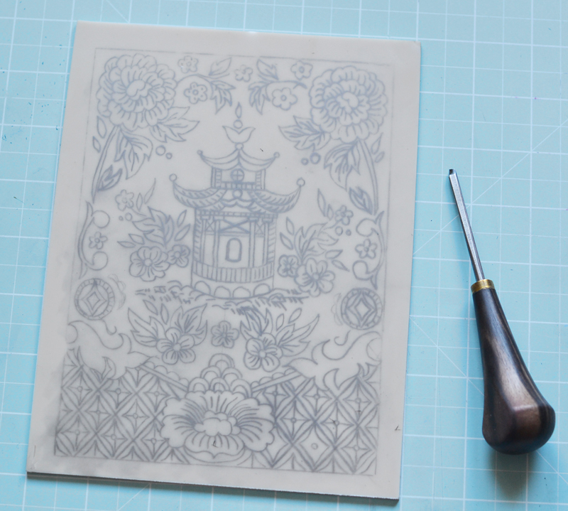 J’avais envie de réaliser des gravures aux détails un peu plus fins que ce qui est possible sur du lino, avec en tête des motifs orientaux. Mes références pour ce travail étaient les motifs peints sur les porcelaines de la compagnie des Indes du 18-19è siècles. Mélange de motifs de paysages et formes géométriques. J’ai donc dessiné plusieurs modèles de motif pour les réaliser en gravure monochrome bleue. J’avais en stock depuis des mois un lot de 10 plaques de gomme fine.