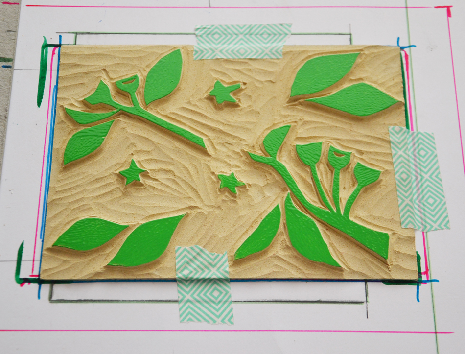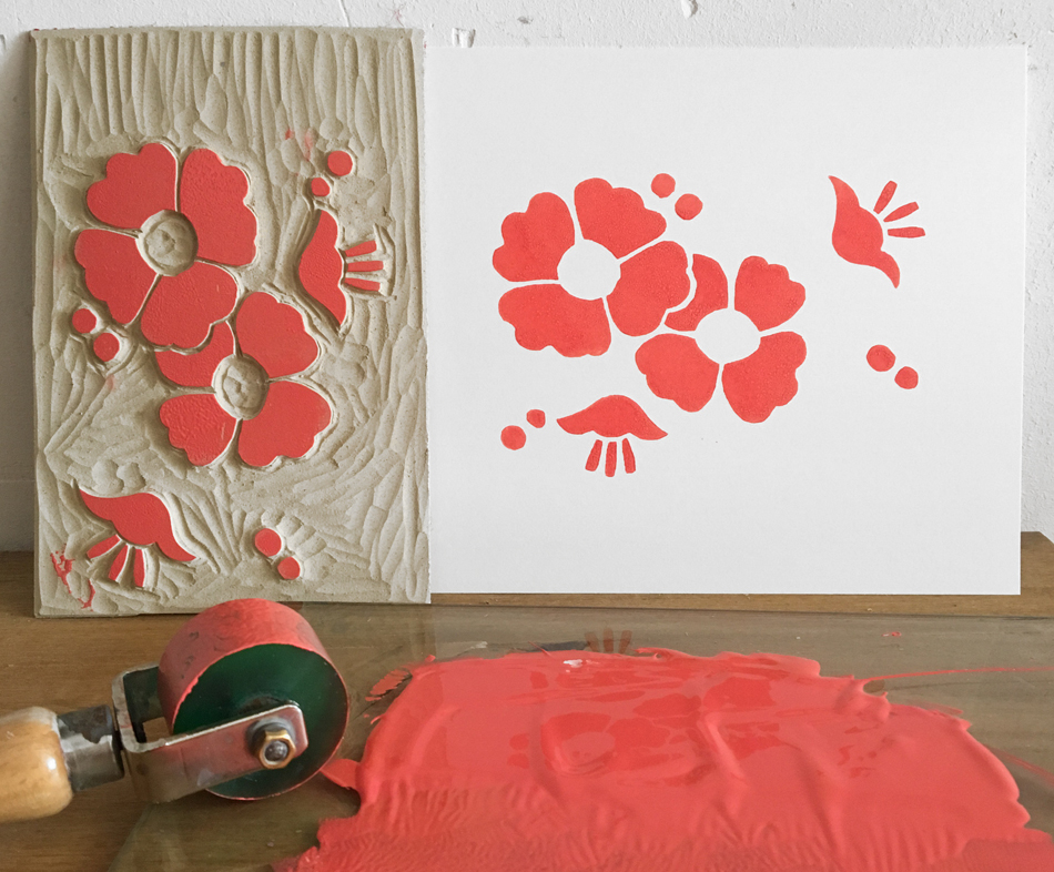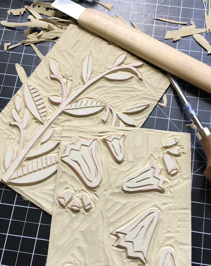 Mon inspiration pour ces gravures, vient des motifs floraux que l’on trouve sur la vaisselle en céramique des années 40 et 50. Les motifs monochrome le plus souvent sont très graphiques et réalisés à l’aérographe. J’adore cette vaisselle ancienne qui a un côté désuet. C’est en pensant à ces motifs que je recherche des compositions très simples. Que j’utilise avec des couleurs très vives, modernisant l’ensemble.