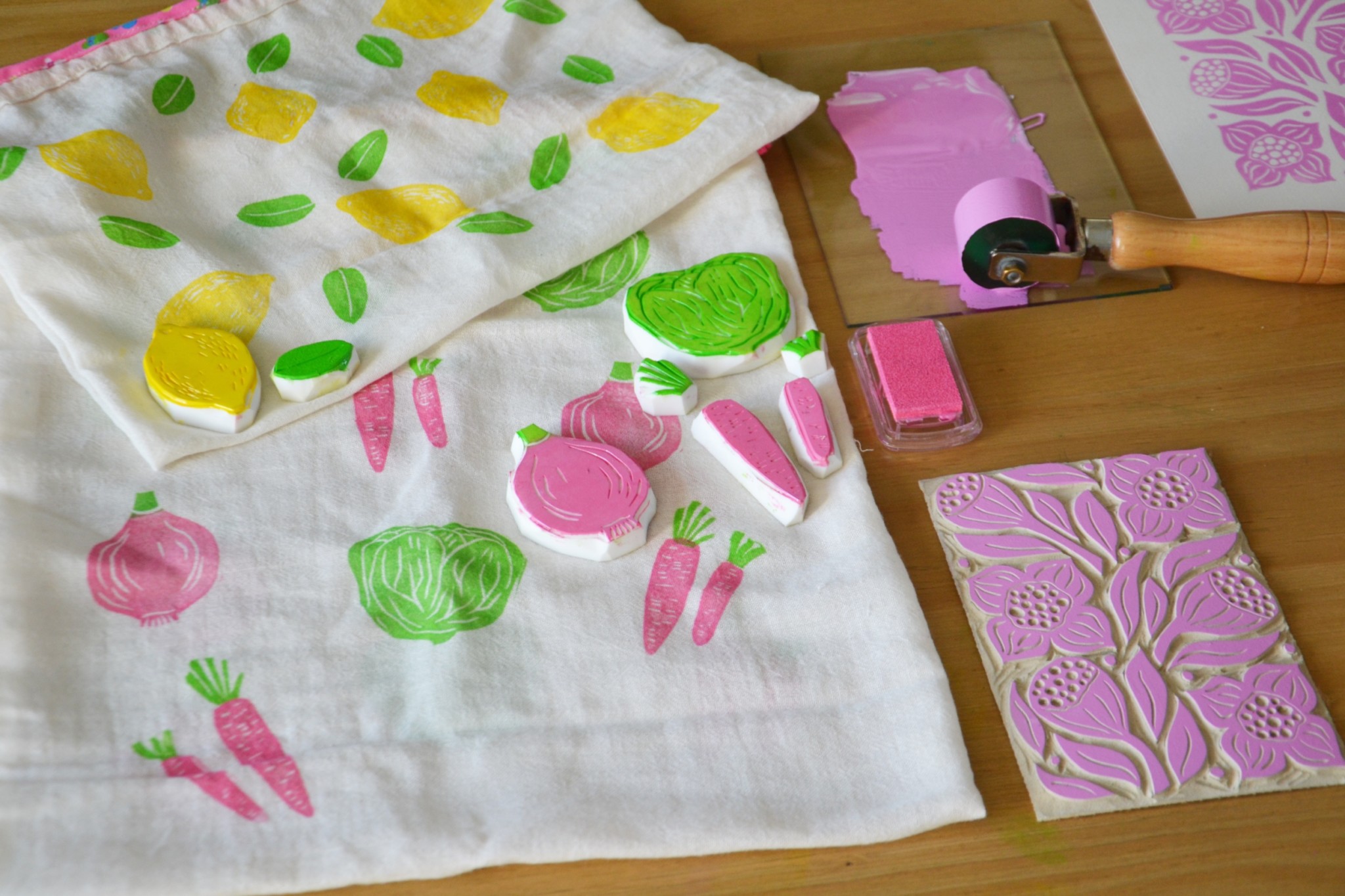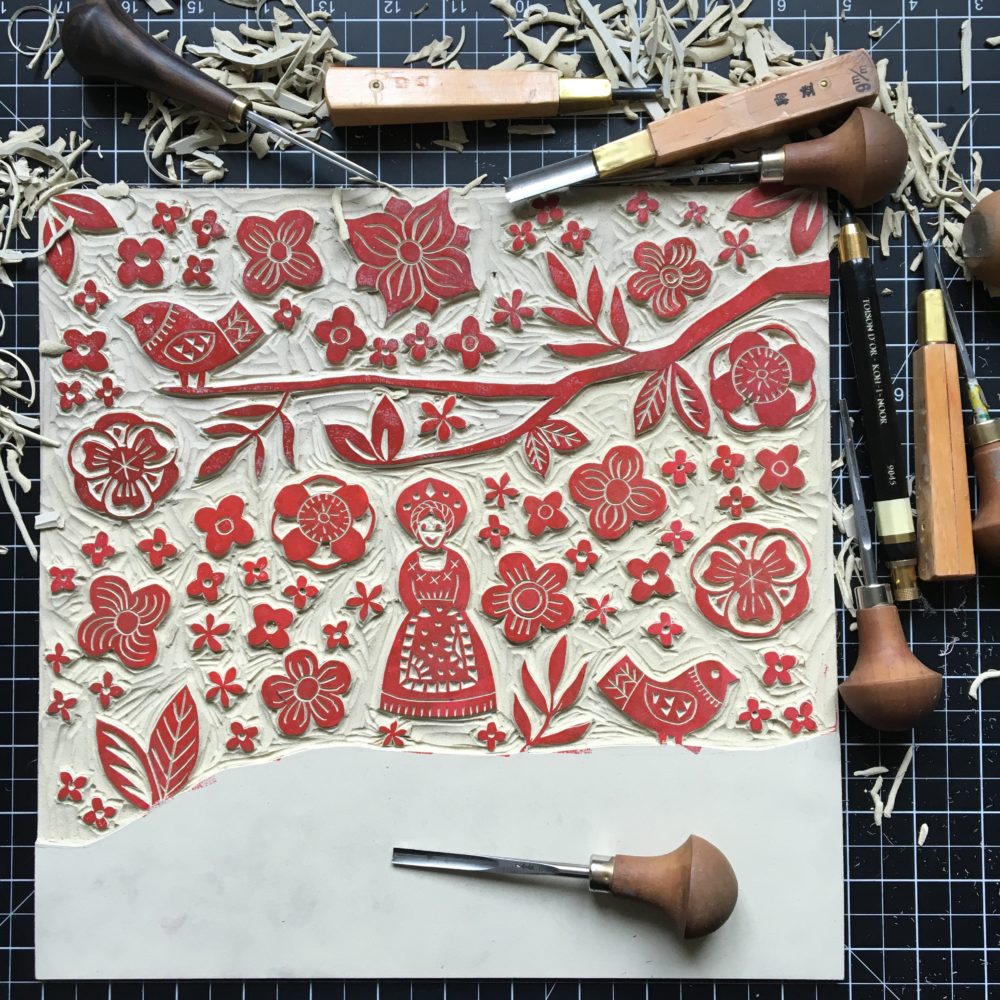 Aimant la nature et le végétal, j’ai suivi des études supérieure en biologie végétale et forestière. Je travaille en parallèle de la création pour l’environnement (la bioéconomie circulaire) thématique que j’intègre à mon travail par un maximum de réemploi de jolies ressources du passé qui deviennent matières premières (draps anciens, tissus vintages,…). La couleur m’amène également vers l’étude de l’art populaire dans lequel le végétal tient souvent une place forte. La richesse de cet art coloré participe à l’inspiration de mon univers. Intéressée par le travail plastique en création, j’aime également mélanger les couleur en approchant d’autres techniques, comme la mosaïque, la couture, le textile imprimé. Mais ma pratique artistique s’est véritablement éclose quand j’ai tenu des gouges en main, et que j’ai imprimé mes premiers tampons et linogravures. Le résultat graphique fut un véritable coup de cœur, et je savais que cela ne me quitterait plus. C’était en 2010.