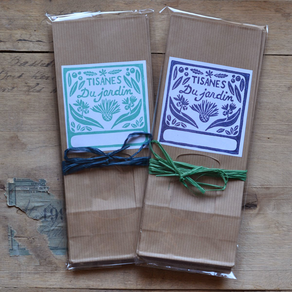 Les étiquettes ont été imprimées à la main avec un tampon gravé par mes soins que j'ai réalisé à partir d'un dessin crée spécialement pour cet usage.
