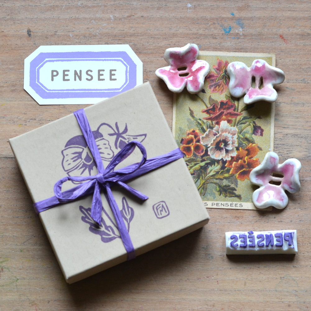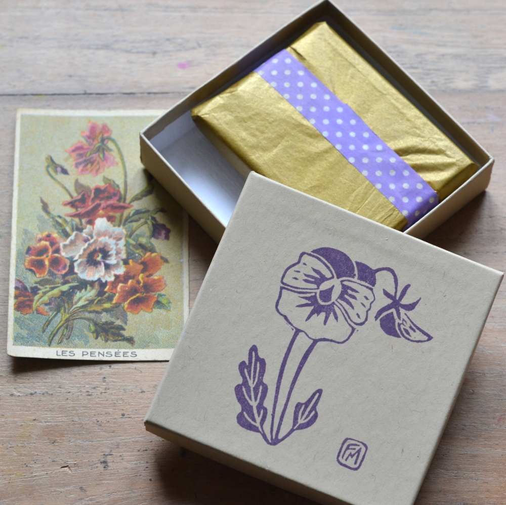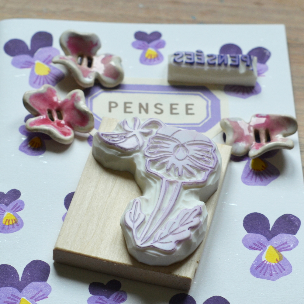 Ce motif est réalisé à partir d’un dessin original que j’ai réalisé, inspiré du même motif réalisé en linogravure présent également en boutique. Sous le tampon, vous apercevez également le « carnet de pensées » disponible aussi dans la boutique.