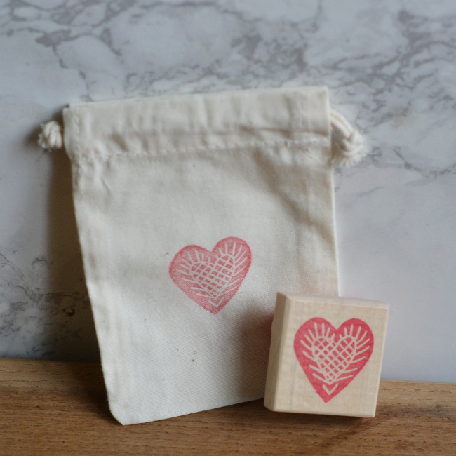 Ce tampon est entièrement artisanal, pour le protéger je vous l’envoie dans un petit pochon de coton biologique, imprimé avec une encre textile.