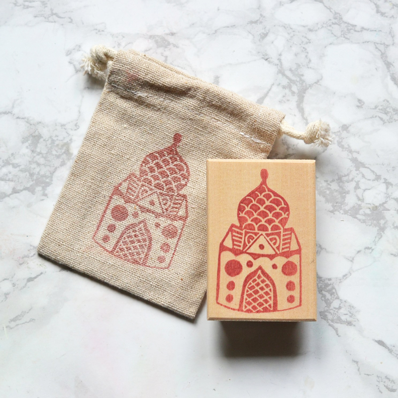 Tampon dont le motif est inspiré des figurines d’art populaire en céramiques de la ville de Dymkovo en Russie. Ce motif représente une maison d’inspiration russe, avec son toit typique en forme de bulbe.