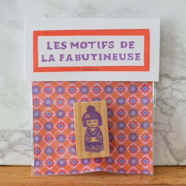 Motif de kokeshi en gravure laser sur caoutchouc. Le tampon est monté sur bois scié et verni à la main minutieusement. Une couche de mousse est collée entre le tampon et le bois pour une impression souple et réussie.