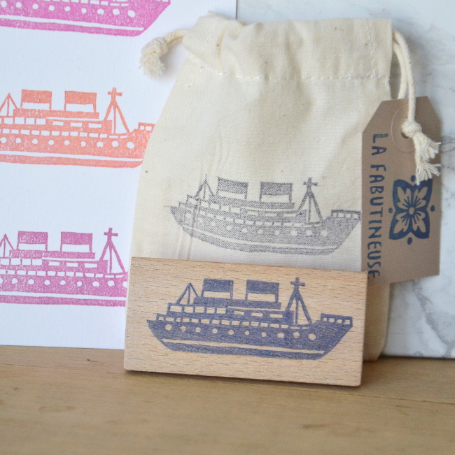 Motif de grand bateau, ou paquebot, réalisé en tampon dans de la gomme gravée à la main, montée sur du bois verni mat transparent.