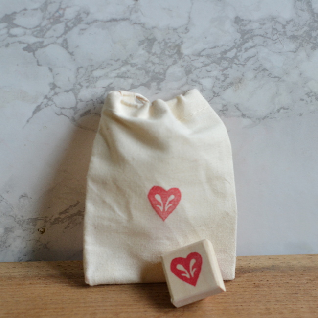 Ce tampon est entièrement artisanal, pour le protéger je vous l’envoie dans un petit pochon de coton biologique, imprimé avec une encre textile.