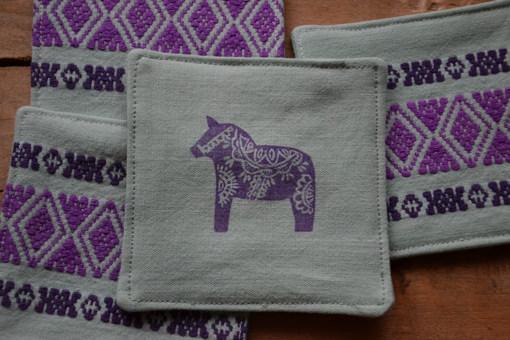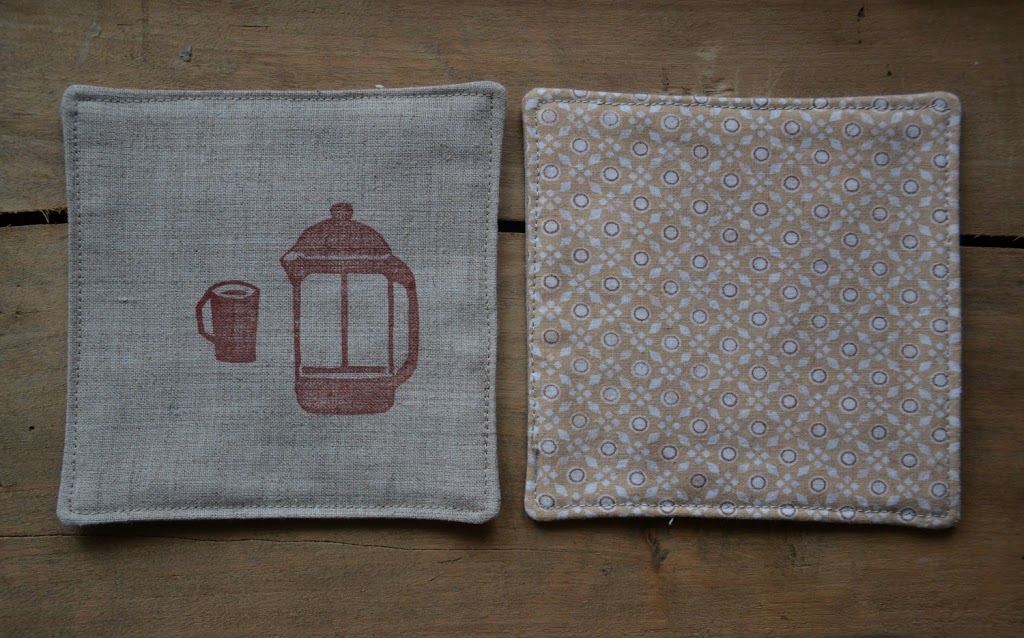 Pour les dessous de verre je voulais que l’on voie le tissu aussi du côté du tampon. J’ai donc mis un morceau à l’endroit, on le retrouve à l’envers. Les tissus sont coordonnés au verso des sets de table.