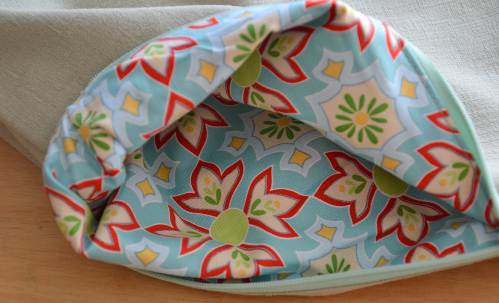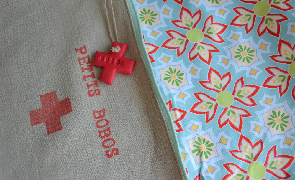 L’an dernier je m’étais fait une trousse pour y ranger le nécessaire à petits bobos elle contient les pansements, désinfectants, anti-moustique, arnica etc, prête à être emmenée partout, j’en ai réalisé une avec du coton teint (la teinture a donné une jolie teinte kaki clair à un drap de coton ancien très épais), et une doublure fleurie.