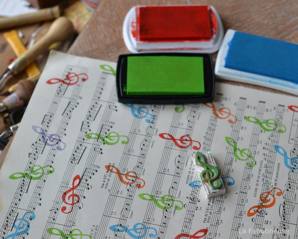 Sur une page de partition de musique, que vous pourrez chiner en brocante, amusez-vous à tamponner le motif en couleur, un peu partout.